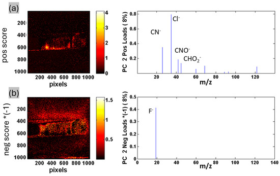 ToF-SIMS images of an inclined slope produced with a focused ion beam and subjected to principal component analysis. PC2 scores (positive (pos) and negative (neg *(-1)), and loadings showing (a) the characteristic DCF signals distributed along the entire ZrNT depth and (b) F− originating from the ZrNTs (electrolyte residue).