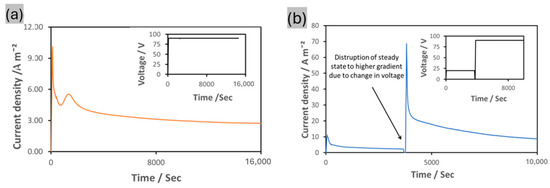 Current density–time curve for the anodization of Zr under conditions of (a) constant voltage and (b) modulated voltage. The inset shows the applied voltage–time conditions.