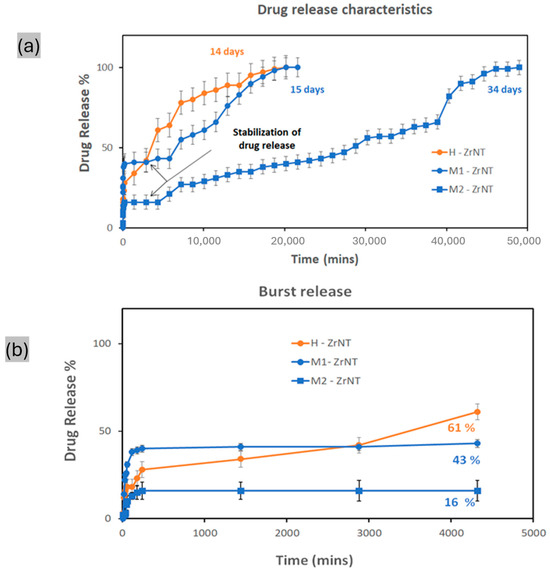 The drug release from these structures was monitored and the cumulative release is graphically presented in Figure 6. Typically for such systems with concentration gradient, the release of the drug is mainly governed by diffusion of the molecules from the nanotubes (a region of high drug concentration) to the solvent medium (a region of low drug concentration) to establish a concentration equilibrium [3]. Hence, in the initial stages, a sudden release of these molecules occurs due to the higher concentration gradient. This phenomenon has a strong clinical implication, as for implants with a drug-eluting surface, sudden release may agitate the local environment and can result in an undesirable host–cell response. However, subsequently, the initial burst release gives way to more gradual zero-order release kinetics [65]. This typical, biphasic release behavior was also observed in the anodic nanostructures, as shown in Figure 6. However, comparing the release patterns from the three investigated platforms, differences in their behaviors were identified in terms of the initial burst release and the total release rate and time. The release characteristics revealed variation in the initial burst (i.e., the percentage released after 4 h); the initial release reduced from 28% to 16% for the H-ZrNTs and M2-ZrNTs, respectively. A possible explanation may be linked to the structural variation; in the H-ZrNTs with a higher pore size of 80 nm ± 20 nm, reduced restriction with a larger influx volume and immediate interaction with the solvent is expected, compared with the modulated structures with a pore diameter of 30 nm ± 20 nm at the top surface where, due to the smaller pore openings, more restricted diffusion is anticipated. These results are in good agreement with publications on structurally similar delivery systems, like TiNTs and NAA. Experiments reported by Losic et al. [41] showed that by reducing the pore size of the nanotube, the initial burst release was inhibited. However, as reported previously, the drawbacks of such an approach using unmodulated structures resulted in the lowering of the loading capacity as well. We addressed this limitation by introducing a double-layered system consisting of a top layer with reduced diameter. This layer minimizes the burst release and subsequently opens into a bottom layer with larger tube diameter for optimal storage of the drug. Additional loading into this layer is propelled by pressure differences within the adjoining capillaries. A summarized representation of these results is shown in Table 2. We achieved maximized loading capacity whilst lowering the burst release and subsequently prolonging the retention within the nanotubes via this double-layer modification, rather than by reducing the diameter along the entire length of the nanotubes. This is a viable solution to enable minimization of the burst release while not compromising on the loading efficiency. While the initial release from the M1-ZrNTs was higher (40%) compared with the H-ZrNTs, which may have been a consequence of the higher capillary forces caused by the smaller diameters, a close examination of the release curve showed stabilization of the drug release from the modulated structures after 4 h. Ultimately, the release from the H-ZrNTs was higher after 3 days, at 61%, compared with 43% for the M1-ZrNTs and 16% for the M2-ZrNTs. This stabilization may be attributed to an increased influence of the bottleneck between the first and second layers in the modulated structure in controlling the flow of drug. The time required for the drug to completely elute varied between the structures: 14 d for H-ZrNTs, 15 d for M1-ZrNTs, and a delayed time of 34 d for M2—ZrNTs. The differences in release time from the modulated structures (15 and 34 days for M1-ZrNTs and M2-ZrNTs, respectively) may have been caused by the length of the first layer, which increased from 2 µm to 7 µm, with the implication that it would take a much longer time for the drug loaded in the second layer to elute from the reservoir in the nanotubes, attributed to a longer diffusion path.