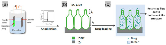 Scheme depicting the methodology for fabricating double-layered ZrNTs with varying diameters for enhanced drug release performance: (a) electrochemical anodization in two-step voltage conditions; (b) double-layered ZrNTs with varying diameters; (c) drug release from these modified structures.