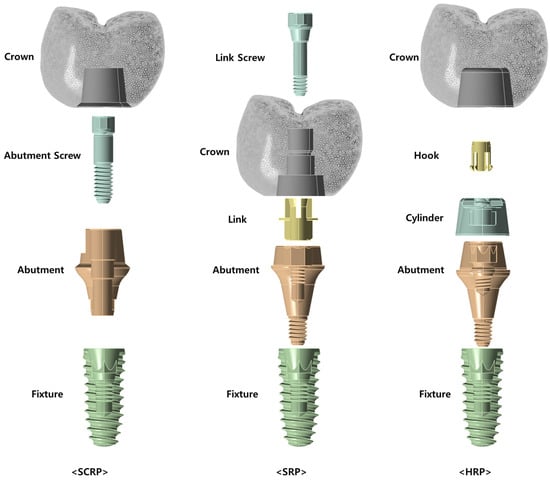 Figure 1 illustrates the configuration and assembly methods of the SCRP, SRP, and HRP systems based on 3D CAD designs. In the SCRP system, the crown is attached to the abutment using cement, and the abutment is connected to the fixture with a screw. In contrast, the SRP system employs a link and link screw to connect the crown and abutment, while the abutment itself is directly connected to the fixture without the need for additional screws. In the case of the HRP system, the crown is cemented to a component called a cylinder, which in turn is connected to the abutment via a hook component. Similar to the SRP system, the abutment of the HRP system is connected directly to the implant fixture without the need for an additional abutment screw.