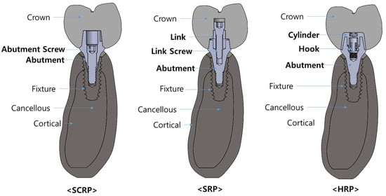 In this study, three different dental implant prosthetic systems were compared (Figure 2): single implants with a screw-and-cement-retained prosthetic system (SCRP), s cementless screw-retained prosthetic system (SRP), and screwless hook-retaining prosthetic (HRP) systems. To evaluate only the influence of the crown–implant connection type, the shapes and dimensions of the alveolar bone, implant fixture, and crown were assumed to be the same in all three 3D experimental models.