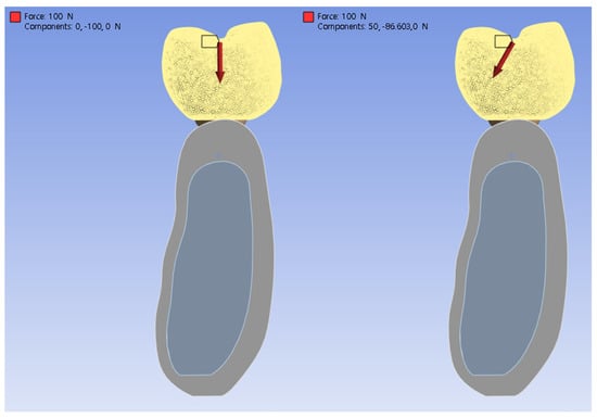 Two loading conditions were applied to each of the three experimental models. Referring to previous studies [6,9] that reported finite element analysis of the implant prosthesis, the occlusal force acting on the crown was set to 100 N, and the direction of the load was set perpendicular to the implant fixture and at an inclination angle of 30° (Figure 3). In this study, it was presumed that the contact condition between the implant and the bone was completely osseointegrated.