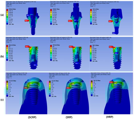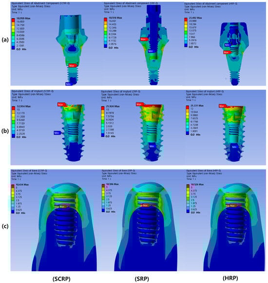 Figure 4 shows the stress distribution in the implant abutment (a), implant fixture (b), and surrounding bone (c) when an axial load of 100 N was applied to each experimental model of SCRP, SRP, and HRP. The location where the maximum stress is concentrated in each experimental model is annotated with a red label. As shown in Figure 4a, the maximum stress concentration of the abutment components of all experimental models occurred inside the implant abutment. The maximum von Mises stress value in the abutment component of the HRP model (23.49 MPa) was larger than those of the SCRP (18.96 MPa) and SRP (18.52 MPa) (Table 2).