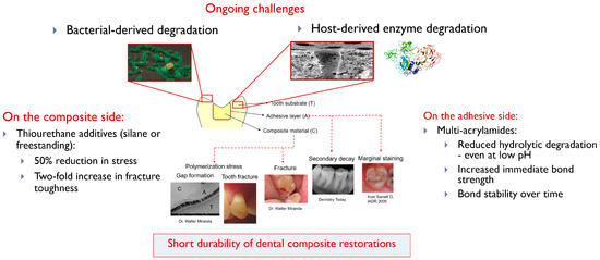 Multi-factorial process leading to the short durability of dental restorations. While strides have been made on the composite and the adhesive materials themselves (one example of improvement strategy provided for each), there are ongoing challenges related to biological factors in the oral cavity.