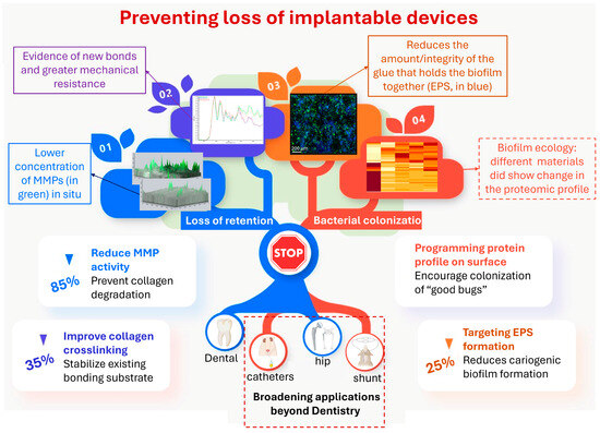 The tree diagram is rooted in preventing the loss of implantable devices, in broader biomedical applications as well as more specifically in Restorative Dentistry. The two main branches (blue or orange) indicate the two main causes for restoration loss. Each of those branches subdivide into approaches to tackle the loss of retention or the bacterial colonization. Branch 1 shows results for in situ zymography in dentin with confocal microscopy. The bottom image in that branch shows decreased MMP activity in the sample treated with the inhibitor in comparison with the control (top image), reprinted from Ref. [14]. Branch 2 shows infra-red spectra demonstrating the change in dentin collagen treated with acrylamide monomers, which led to complete stabilization of the bonded interface, reprinted from Ref. [14]. Branch 3 shows a Streptococcus mutans biofilm that was treated with a GTF inhibitor, leading to decreased production of polysaccharides in the extracellular matrix (stained in blue), without killing the bacteria (stained in green), reprinted from Ref. [15]. Branch 4 shows the proteomic profile of the acquired pellicle formed on the surface of materials with systematically increased hydrophilicity, showing enrichment of certain proteins as the hydrophilicity increases, reprinted from Ref. [16].