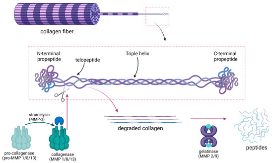 Collagen structure showing the cleavage site for collagenases at the telopeptide region. Pro-collagenases are activated by stromelysin into collagenases, which cleave the triple helix into smaller segments. These segments are then prone to degradation by gelatinases, resulting in the formation of peptides.