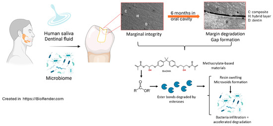 Representation of the hydrolytic and enzymatic degradation sustained by methacrylate-based materials in the oral cavity in the presence of human saliva and oral microbiome.
