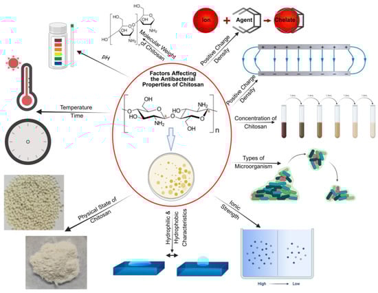 The figure depicts the different factors that affect the antibacterial properties of chitosan. Created with BioRender.com. Accessed on 25 November 2024.