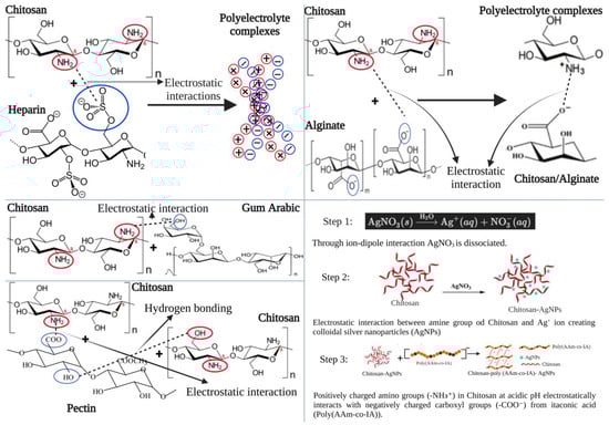 Electrostatic and hydrogen bonding interactions between chitosan and other polymers. Red color circles represent amino group (+) of chitosan and blue color circles represent different negatively charged groups. Created with BioRender.com. Accessed on 9 January 2025.