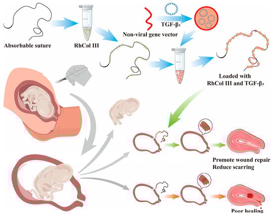 This study innovatively presents a brand-new method for treating uterine scars. Skillfully, it makes use of the indispensable suture material in the surgical procedure. The recombinant human type III collagen (RhCol III) and the gene medicine transforming growth factor-β3 (TGF-β3) are directly integrated into the sutures, ensuring that after the suturing operation is completed, the medicine can precisely and fully contact the wound site.
