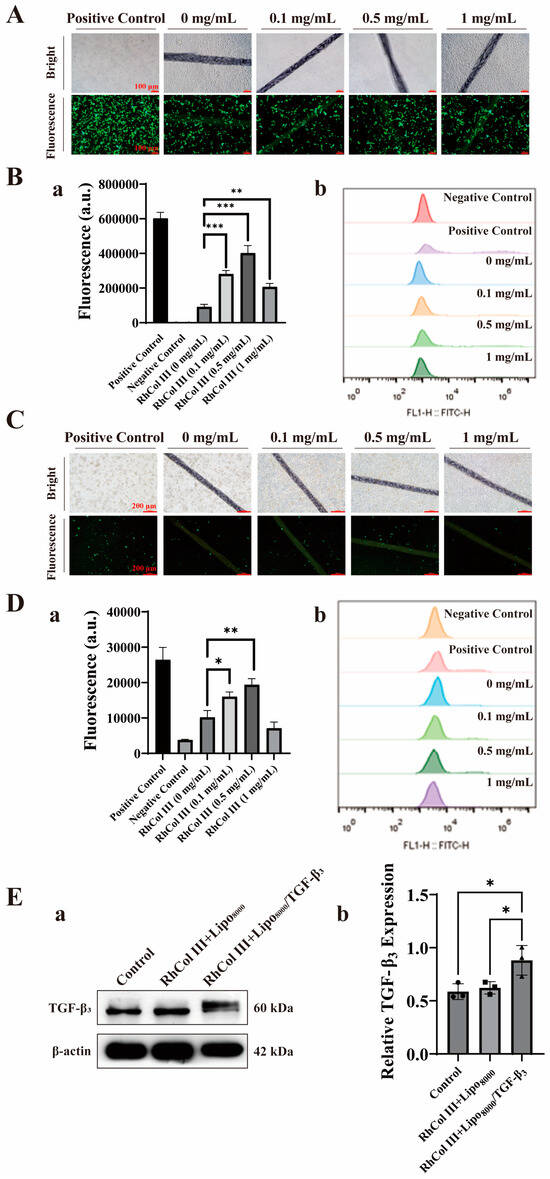 In vitro expression of medicine-loaded sutures. (A,C) Expression results of TGF-β3 in 293T cells (scale bar: 100 μm) and human endometrial stromal cells (hESCs) (scale bar: 200 μm) for sutures coated with different concentrations of RhCol III. (B) (a,b) Flow cytometry-based quantitative analysis of transfection efficiency in 293T cells. (D) (a,b) Flow cytometry-based quantitative analysis of transfection efficiency in hESCs. (E) (a,b) Western blot analysis of hESCs after transfection for 48 h. Each value represents the mean ± SD. (the more asterisks (*) there are, the stronger the significant difference indicates, * p < 0.05, ** p < 0.01, *** p < 0.001). Due to the inherent characteristics of the cells, the transfection efficiency of hESCs (human endometrial stromal cells) was significantly weaker than that of 293T cells (C). Quantitative analysis using flow cytometry showed that sutures treated with RhCol III at a concentration of 0.5 mg/mL demonstrated better transfection efficiency, which was consistent with the previous fluorescence quantitation results obtained with 293T cells (D) (a,b).