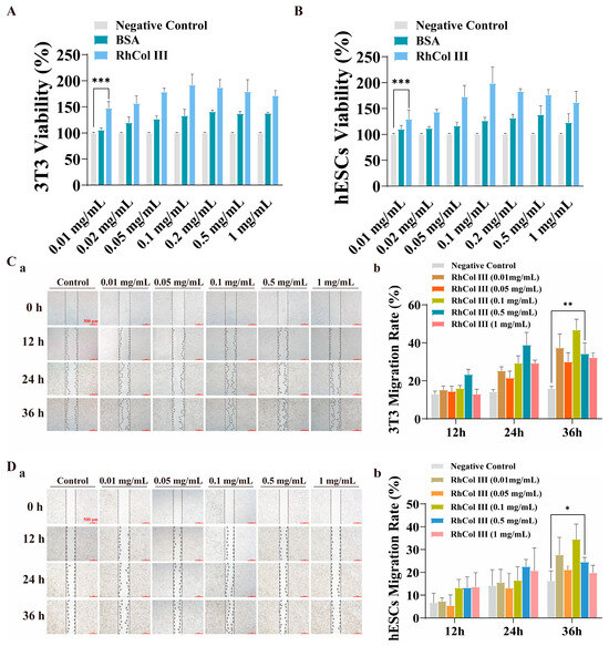 The ability of RhCol III to promote cell proliferation and migration. (A,B) The proliferative effects of various concentrations of RhCol III on 3T3 cells and hESCs. (C) (a,b) The migration-promoting effect of different concentrations of RhCol III on 3T3 cells at various time points (scale bar: 500 μm) and statistical analysis of cell migration rates. (D) (a,b) The migration-promoting effect of different concentrations of RhCol III on hESCs (scale bar: 500 μm) and statistical analysis of cell migration rates. (the more asterisks (*) there are, the stronger the significant difference indicates, * p < 0.05, ** p < 0.01, *** p < 0.001).