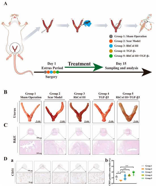 Rats were randomly assigned to five distinct groups: (i) the sham group, which underwent a 2 mm transverse incision on the uterus followed by suturing without any curettage; (ii) the scar model group, in which a model of uterine scar was established and sutured using untreated sutures; (iii) the RhCol III group, where a uterine scar model was created, and the sutures were soaked in RhCol III solution for 30 min followed by adsorption of Lipo8000/Fish sperm DNA solution for 20 min, then air-dried before suturing; (iv) the TGF-β3 group, where a uterine scar model was established, and the sutures were soaked in the Lipo8000/TGF-β3 solution for 20 min, then air-dried before suturing; (v) the RhCol III+TGF-β3 group, in which a uterine scar model was created, and the sutures soaked in RhCol III solution for 30 min were further used to adsorb the Lipo8000/TGF-β3 solution for 20 min, followed by air-drying before suturing. Two weeks after the surgery, the rats were euthanized and the uterine tissues were collected.