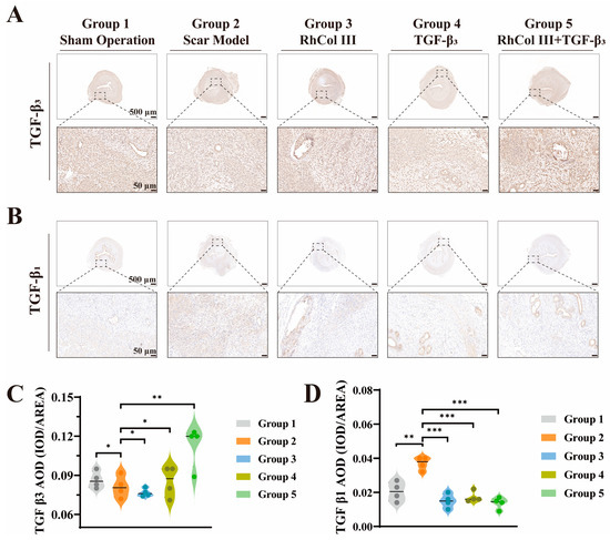 Immunohistochemical staining and expression analysis of transforming growth factor-β3 and -β1. (A) Corresponding immunohistochemical staining for TGF-β3. Scale bars: 500 μm, 50 μm. (B) Corresponding immunohistochemical staining for TGF-β1. Scale bars: 500 μm, 50 μm. (C) Quantitative analysis of TGF-β3 protein expression levels. (D) Quantitative analysis of TGF-β1 protein expression levels. (the more asterisks (*) there are, the stronger the significant difference indicates, * p < 0.05, ** p < 0.01, *** p < 0.001).