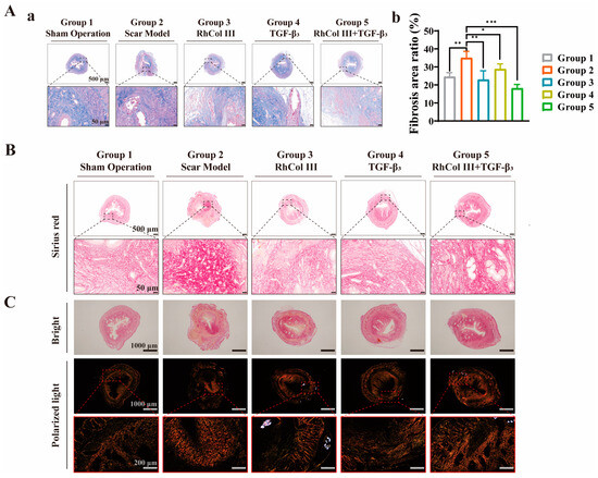 After Masson staining, the collagen fibers in the tissue sections appeared blue. In the model group, partial loss of the outer edge was observed during the tissue fixation stage. However, this did not affect the morphology of the endometrial and myometrial layers. Poor healing of the myometrium and pouch-like spaces resembling diverticula were clearly visible. Both the RhCol III group and the TGF-β3 group showed a reduction in blue collagen deposition to varying degrees. The uterine layer morphology of the RhCol III + TGF-β3 group was more similar to that of the intact uterine layer in the sham-operated group, with relatively less blue collagen deposition. A quantitative analysis using the ImageJ software tool revealed that compared with the scar model group, the fibrosis rate of the RhCol III + TGF-β3 group decreased by 16.8%. Moreover, compared with other groups, the RhCol III + TGF-β3 group had the smallest fibrotic area, further confirming that the synergistic effect of RhCol III and TGF-β3 had a significant antifibrotic effect (p < 0.01, Figure 7A(a,b)).
