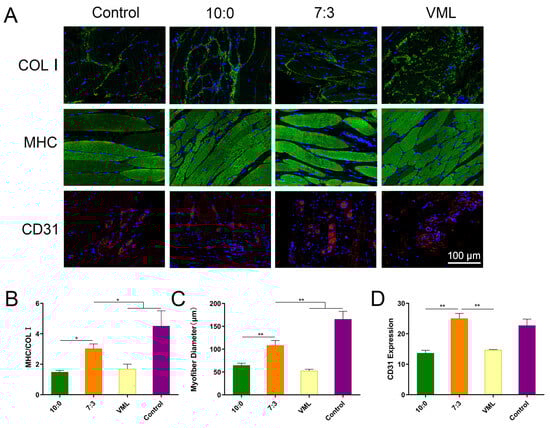 - Qiu, X.; Liu, S.; Zhang, H.; Zhu, B.; Su, Y.; Zheng, C.; Tian, R.; Wang, M.; Kuang, H.; Zhao, X.; et al. Mesenchymal stem cells and extracellular matrix scaffold promote muscle regeneration by synergistically regulating macrophage polarization toward the M2 phenotype. Stem Cell Res. Ther. 2018, 9, 88. [Google Scholar] [CrossRef]