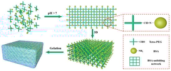 Among various non-toxic crosslinking strategies, PEG-based systems are especially appealing due to their enhanced biocompatibility, present FDA approval, and metabolic elimination from the body [17,18]. PEG hydrogels, however, often lack sufficient mechanical strength. To circumvent this limitation, PEG–protein hybrid gels have been designed, which would inherit the advantages of both (PEG′s role as a toxic and biocompatible modifier, with proteins like BSA presenting biological functionality, fulfilling molecular recognition) [2,19]. For instance, such networks can be formed when tetra-armed PEG (Tetra-PEG) containing aldehyde functional groups is crosslinked with amino functional groups of BSA to promote rapid gelation kinetics, better swelling behavior, high optical transmittance, and mechanical properties such as toughness and anti-fatigue features [20].