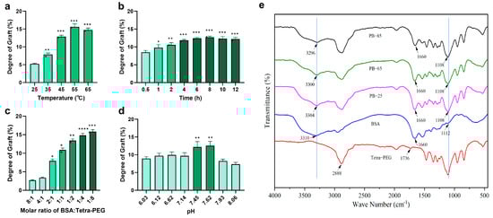 Graphs showing the grafting degree (GD) of BSA-PEG hydrogels under different conditions: (a) temperature, (b) time, (c) molar ratio, (d) pH, and (e) Fourier transform infrared spectroscopy (FTIR) spectra of BSA-PEG hydrogels at different temperatures. The symbols “*”, “**”, “***” and “****” represent the levels of statistical significance between groups, with the following meanings: p < 0.05 (significant difference), p < 0.01 (highly significant difference), p < 0.001 (very highly significant difference), and p < 0.0001 (extremely highly significant difference), respectively.