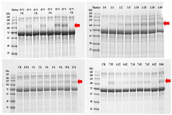 Graphs of SDS-PAGE images reflecting different temperature conditions, reaction times, molar ratios of reactants, and pH levels in the reaction system. (The red arrows highlight specific protein bands from the reactions, showing significant shifts in molecular weight under different conditions).