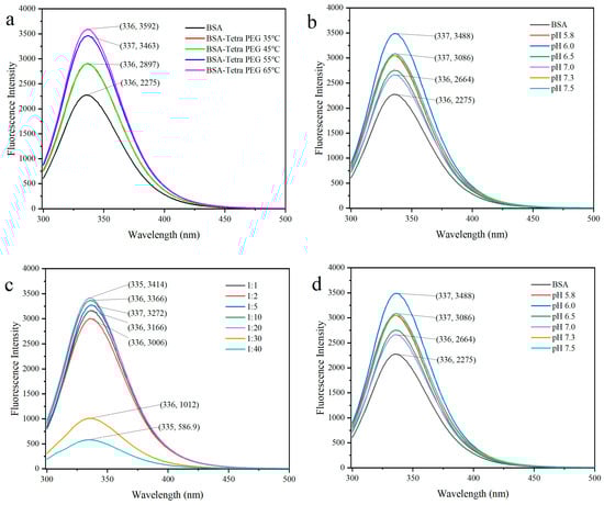 Fluorescence spectra of PEG-BSA mixed solution under different (a) temperature conditions, (b) reaction times, (c) molar ratios, and (d) pH levels in the reaction system.