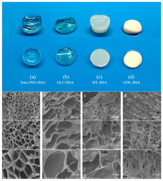 Macroscopic appearance and microscopic morphology of hydrogels: (a) Tetra-PEG-BSA, (b) GLU-BSA, (c) HT-BSA, and (d) GDL-BSA. Scanning electron microscopy (SEM) images at varying magnifications reveal the internal microstructures of each hydrogel.