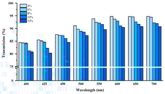 Optical transmittance of the hydrogels was investigated using a UV spectrophotometer at a wavelength range of 400–700 nm, with distilled water as the calibrator. The hydrogels were cut into slices with a thickness of 2 mm and adjusted to the inner wall of glass cuvettes for the interrogation of the light beam across the biomass sample. As shown in Figure 7, transmittance generally increased with longer wavelengths, indicating that the hydrogels absorbed or scattered less light in the red region compared to the blue region of the visible spectrum. Sample 5 (12%) exhibited the lowest transmittance across all measured wavelengths, suggesting a denser network or increased particulate presence that reduces optical clarity. Sample 1 (4%) demonstrated the highest transmittance, indicating improved optical clarity. These differences became more pronounced at longer wavelengths (600–700 nm), likely due to variations in structural properties such as polymer concentration, degree of grafting, or crosslinking density [42,44]. Hydrogels with higher transmittance, such as S1, may possess fewer scattering centers, making them suitable for applications requiring optical transparency, such as contact lenses, optical sensors, or biomedical devices [43]. Conversely, hydrogels with lower transmittance, like S5, reflect network irregularities or increased microstructural opacity.