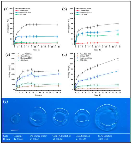The swelling behavior of the hydrogels reveals clear differences across different hydrogels and in different solutions (Figure 8). Tetra-PEG-BSA gels consistently exhibit the highest swelling ratios due to their uniform, highly crosslinked, and porous network structure, as observed in the SEM analysis in Figure 6. This superior performance is maintained even in denaturing solutions such as guanidine hydrochloride, urea, and SDS, reflecting the robustness and stability of their crosslinked network. In contrast, GLU-BSA, HT-BSA, and GDL-BSA gels show limited swelling capacity, especially under chemical denaturation conditions, due to their irregular or compact microstructures and weaker crosslinking efficiency. These results highlight the importance of optimizing crosslinking strategies to improve the network uniformity and chemical stability of hydrogels, making them suitable for applications requiring high swelling capacity and structural robustness under various environmental conditions [42,44,46].