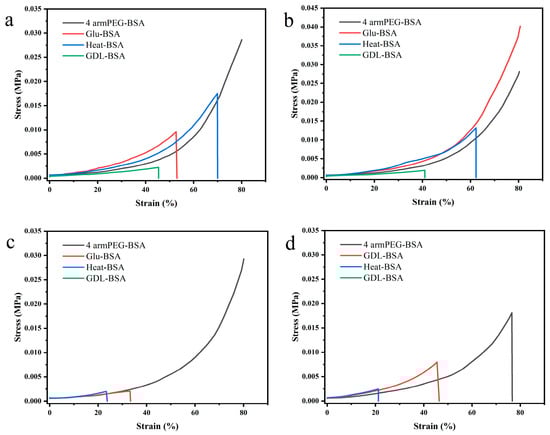 Stress–strain curves of Tetra-PEG-BSA, GLU-BSA, HT-BSA, and GDL-BSA hydrogels after swelling in (a) water, (b) 4 mol/L Gdn HCl solution, (c) 8 mol/L urea solution, and (d) 20 mmol/L SDS solution.