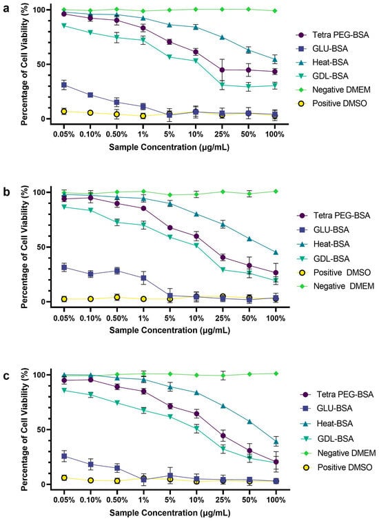 The cell viability of Tetra PEG-BSA, Glu-BSA, Heat-BSA, and GDL-BSA hydrogels at different concentrations (0.05–100%) was assessed using the MTT assay over 24, 48, and 72 h, as illustrated in Figure 10. The findings indicate that Tetra PEG-BSA and Heat-BSA hydrogels demonstrate superior biocompatibility compared to Glu-BSA and GDL-BSA, with cell viability decreasing in a concentration- and time-dependent manner.