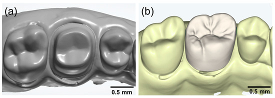 Dental typodont model used in this study. (a) Digitized working cast obtained through intraoral scanning. (b) Designed crown.