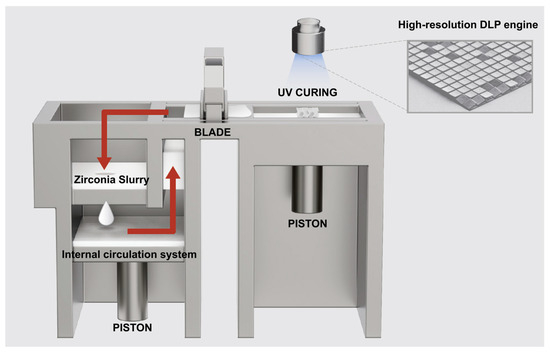 Schematic representation of the DLP 3D printing system used in this study. The arrows indicate the flow of the zirconia slurry within the internal circulation system, which ensures a consistent material supply for the printing process. (The arrows in the figure indicate the flow of the zirconia slurry within the internal circulation system).