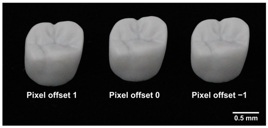Among various 3D printing techniques utilized in digital dentistry, vat photopolymerization is one of the most extensively applied methods, wherein light-sensitive resins are selectively cured layer by layer [18,19]. Stereolithography (SLA) technology employs a laser to achieve high-resolution fabrication but requires extended production time [20]. In contrast, digital light processing (DLP) utilizes a digital micromirror device to project entire layers simultaneously, offering enhanced efficiency and cost-effectiveness compared to SLA [21,22]. In DLP printing, the pixel size of the projected image determines the resolution of the XY plane, and modifying the pixel offset can enhance dimensional accuracy [23,24,25]. Additionally, adjusting the pixel offset can compensate for the material shrinkage or expansion that occurs during fabrication, which varies depending on the printing material, such as polymers, ceramics, and metals [26].
