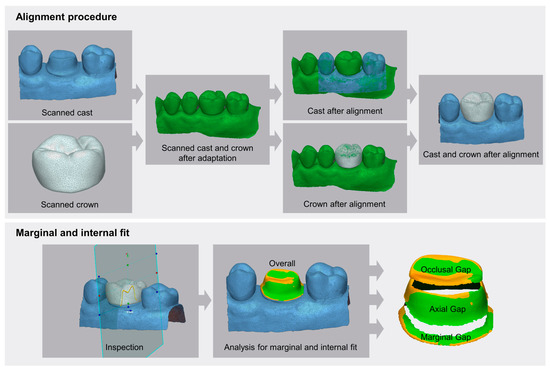 Evaluation method for marginal and internal fit analysis. The alignment procedure was performed using the scanned cast and crown in their adapted state. The arrows indicate the sequential steps in the alignment process, where the scanned cast and crown were used as reference data for alignment. The gap between the intaglio surface of the aligned crown and the cast was analyzed across all corresponding point cloud data. (The arrows in the figure illustrate the step-by-step procedure of the alignment process and marginal/internal fit analysis).