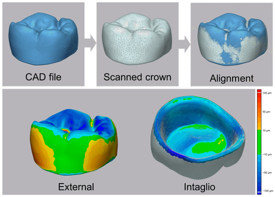 The alignment of the scanned crowns with the CAD reference model was conducted using a best-fit registration method in 3D inspection software (Geomagic Control X; Version 2017.0.1; 3D Systems, Rock Hill, SC, USA) (Figure 5). The analysis was performed separately for the external and intaglio surfaces to evaluate fabrication accuracy (Figure 5).