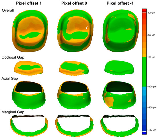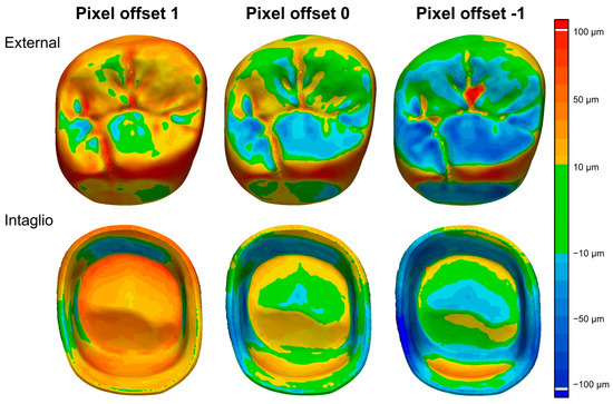 The negative error distribution was most pronounced at a pixel offset of −1, as indicated by the increased presence of blue-shaded regions, particularly on the intaglio surface (Figure 7). The largest negative errors were observed at a pixel offset of −1 (32.1 ± 3.9 µm overall, 28.7 ± 4.3 µm external, and 36.6 ± 4.0 µm intaglio), whereas the pixel offset of 1 had the smallest negative errors (Figure 7). The pixel offset of 0 displayed an intermediate distribution, with both positive and negative deviations present in the color maps (Figure 7).
