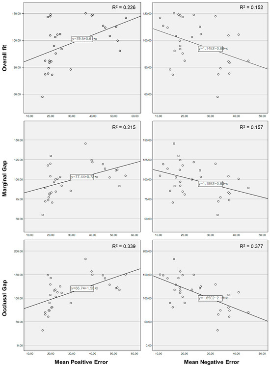 The correlation analysis between intaglio surface trueness and the marginal and internal fit of zirconia crowns fabricated using DLP 3D printing revealed statistically significant relationships between specific parameters. A moderate positive correlation was observed between overall fit and mean positive error (PCC = 0.475, p = 0.008), indicating that an increase in positive deviations in the intaglio surface was associated with a deterioration in overall fit accuracy. Conversely, overall fit exhibited a weak negative correlation with mean negative error (PCC = −0.390, p = 0.033), suggesting that negative deviations contributed to improved adaptation. Similarly, the marginal gap showed a moderate positive correlation with mean positive error (PCC = 0.464, p = 0.01) and a weak negative correlation with mean negative error (PCC = −0.396, p = 0.03). Among the evaluated parameters, the occlusal gap demonstrated the strongest correlations, exhibiting a moderate positive relationship with mean positive error (PCC = 0.582, p < 0.001) and a strong negative correlation with mean negative error (PCC = −0.614, p < 0.001). No statistically significant correlations were identified between axial gap and any of the surface trueness parameters (p > 0.05). A previous study reported a strong positive correlation between trueness and fitness, indicating that a decrease in trueness (i.e., lower accuracy) is associated with a deterioration in both marginal and internal fit [49].
