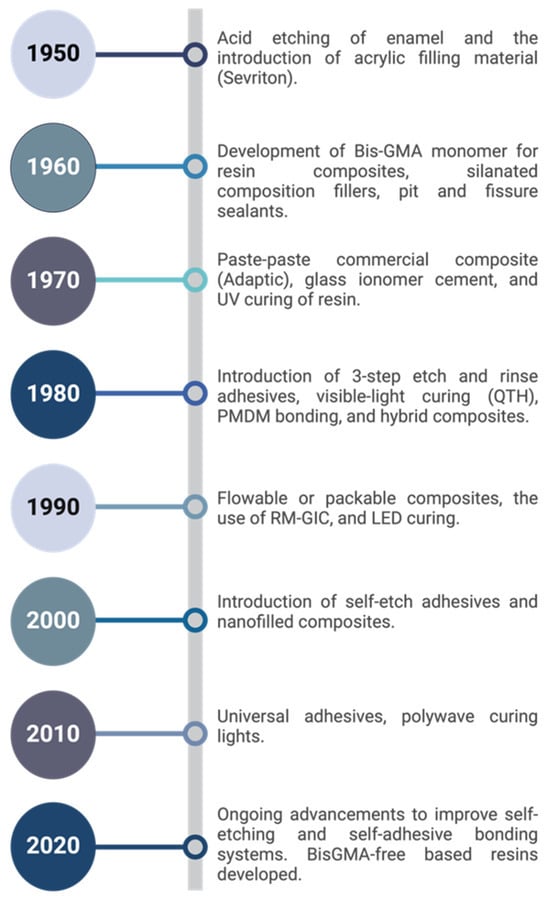 Timeline of milestones in dental resin adhesive development [3,15,23,24,25,26,27,28,29].