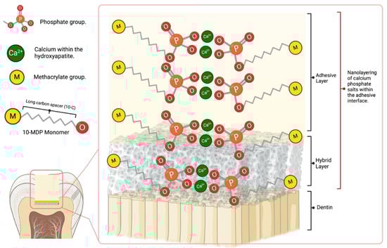 Stable MDP-calcium salts are formed during this reaction and deposited in self-assembled nano-layers, illustrated in Figure 2 [117]. Nano-layering of 10-MDP_Ca salts was documented to still exist after 1 year of water storage, and it was found to be aging-resistant due to the low dissolution rate [97,118]. This ionic bond makes the adhesive interface more resistant to biodegradation [37,67,116]. The bonding strength, e.g., micro-tensile bond strength (μTBS), was maintained after 1 year of aging [119]. The good in vitro and clinical outcomes of the Clearfil SE Bond, an adhesive containing 10-MDP, may be partly attributed to its intense chemical adhesion with tooth tissue [4]. It was proven that 10-MDP or 10-MDP-Ca salt inhibits the matrix metalloproteinases (MMPs) that accelerates the degradation of the hybrid layer, which in turn reduces nanoleakage of the bonding interface and improves its durability [120]. Van Landuyt et al. considered the most promising monomer for chemical adhesion to the hydroxyapatite to be 10-MDP. Feitosa et al. (2014) studied the influence of spacer carbon chains in acidic functional monomers on self-etch dental adhesives’ physical and chemical properties. They found that highly hydrophilic monomers with longer spacer carbon chains increased wettability and water sorption on dentine surfaces, affecting the ultimate tensile strength of one-step self-etch adhesives [121].