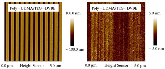 Biostability Comparison of Resin Networks. Atomic force microscope (AFM) scans illustrate the biostability contrast between a hybrid resin network, poly-UDMA/TEG-DVBE (left), and a methacrylate-based resin network, poly-UDMA/TEGDMA (right). Nano-scale line-and-space patterns (line-height: 110 nm; line width: 135 nm) were imprinted onto the two resin networks using nanoimprint lithography. The images show the patterns after exposure to the enzyme pseudocholine esterase for 3 days, highlighting the differential resistance to enzymatic degradation.
