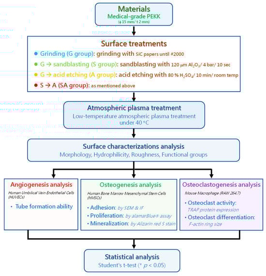 The synergistic application of the above surface treatment processes shows promising clinical potential for enhancing the biocompatibility of PEKK implants. The objective of this study was to fabricate a superhydrophilic 3D porous PEKK surface by simply combining mechanical sandblasting, chemical sulfonation, and physical low-temperature (<40 °C) atmospheric plasma treatments. This simple and rapid hybrid surface treatment process was expected to positively affect the angiogenesis and bone remodeling of PEKK implant surfaces during osseointegration.