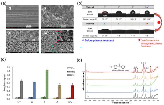The dramatic reduction in the contact angle (<10 °C) of the S, A, and SA groups, shown in Figure 2b, suggested that the low-temperature atmospheric plasma treatment significantly induced hydrophilicity. Notably, the G group did not significantly decrease the water contact angle following the plasma treatment, which may be attributed to its distinct surface character.