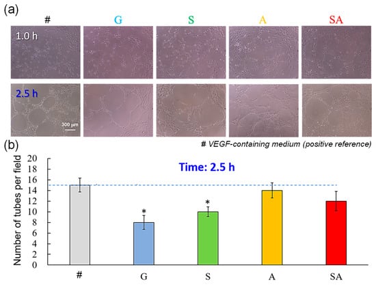 Figure 3 presents the angiogenesis property, in terms of tube formation ability, by HUVECs exposed to the condition medium of the test specimens: (a) optical microscope micrograph at 1 and 2.5 h; (b) corresponding number of tubes per field at 2.5 h. The VEGF-containing medium was used as a positive reference. As shown in Figure 3b, the test specimens demonstrated varying levels of tube formation ability, with the A group showing the highest ability (1.7-fold increase in tube formation compared to the G group), followed by the SA group (1.5-fold), S group (1.2-fold), and G group (control), which exhibited the least ability to induce tube formation. Although the VEGF-containing medium showed the best tube formation ability, the A and SA groups also showed compatible tube formation ability with the positive reference (VEGF-containing medium).