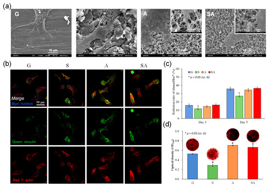 Osteogenesis property, in terms of adhesion, proliferation, and mineralization, by hMSCs cultured on the test specimens: (a) 3 h cell adhesion morphology observed by FE-SEM; (b) 3 h cell adhesion morphology observed by immunofluorescent staining; (c) 5 d cell proliferation analyzed by alamarBlue® assay; (d) 14 d cell mineralization analyzed using Alizarin red S staining (* p < 0.05 vs. G).