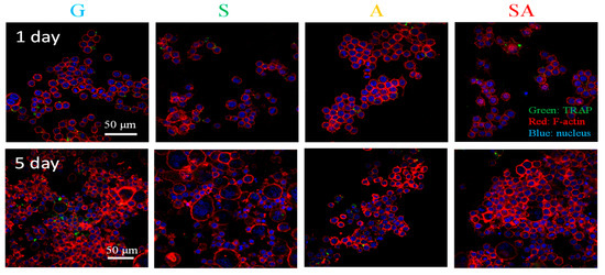 Figure 5 presents the osteoclastogenesis property, in terms of TRAP expression (green point) and F-actin ring size (red color) observed by immunofluorescent staining, by RAW 264.7 macrophage cells cultured on the test specimens for 1 and 5 d. At day 1, there were no significant differences in TRAP protein expression and F-actin ring size between the test specimens. At day 5, the osteoclast activity, as determined by TRAP protein expression, demonstrated a rank order of A ≈ SA ≈ S < G, where specimens A, SA, and S exhibited comparable TRAP levels, which were slightly lower than those observed in the G specimen. For osteoclast differentiation, evaluated by the size of the F-actin ring the A, SA, and G specimens exhibited comparable F-actin ring sizes, with a reduction from approximately 0.3- to 0.5-fold in size compared to the S specimen. Overall, the A and SA groups exhibited a slight inhibition in osteoclastogenesis compared to the G group (control).