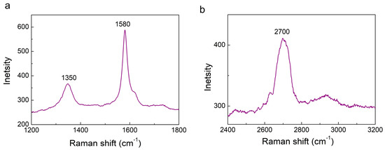 The characteristic Raman profiles of the ball-milled graphite nanoparticles functionalized with PVP molecules (CBN/PVP) are shown in Figure 1a,b. The presence of a D band at ≈1350 cm−1, a G band at ≈1580 cm−1, and a 2D band at ≈2700 cm−1 can be seen in the graphitic structure. All three bands (D, G and 2D) are visibly broadened. The G peak corresponds to the optical E2g phonons and is associated with the stretching mode of the C–C bond (i.e., sp2 bond). The D peak represents the breathing mode of aromatic rings that arise due to defects in the sample. D peaks and their overtone 2D peaks are often used as a measure of the degree of defects in a graphitic structure. Thus, the broadened D and 2D bands can be assigned to the defects and disordering involved in the hexagonal graphitic layers upon milling, as well as the decrease in the lateral dimension of the milled CBN/PVP sample. Additionally, the intensity of the G band is still higher than that of the 2D band, indicating the multilayer graphite nature [20].