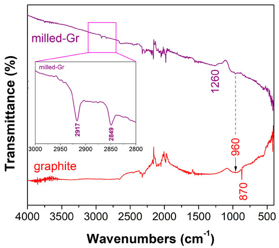 The ATR-FTIR spectra of the pristine graphite flakes (SGL Carbon, Bonn, Germany) before and after the ball-milling process are shown in Figure 3. The almost featureless characteristics of the spectra are due to the metallic-gray (dark-gray) color of the graphite (CBN/PVP). The presence of weak transmittance peaks at 870 cm−1 in the pristine graphite can be assigned to the asymmetric ring stretching [21]. This peak is absent in the milled graphite sample, indicating the strong disorder inside the structure of the processed sample. An additional broad peak centered at c.a. ≈960 cm−1 observed in the ATR-FTIR spectra of both samples could be assigned to C–O stretching, indicating the presence of oxygen-containing groups on the edges of the structural layers. It is interesting to note the two weak peaks observed at 2849 cm−1 and 2917 cm−1 in milled CBN/PVP (Figure 3), which correspond to the symmetric and antisymmetric stretching of the methylene group (–CH2–). Thus, the surface functionalization of milled graphite nanoparticles with PVP molecules is confirmed by the FTIR spectra (absorption bands at 2840–2940 cm−1 appear only in PVP-modified carbon nanomaterials). The disordered structure of the milled graphite is more reactive and capable of adsorbing molecules (e.g., PVP, airborne hydrocarbon) on its surface upon exposure to ambient air [22]. In addition, the weak and broad band at ≈1260 cm−1, observed in the processed sample, can be assigned to the stretching vibration of the –C–N– bonds due to the adsorbed PVP molecules. The peaks between 2370 and 1780 cm−1 are due to the noise of the FTIR spectra.