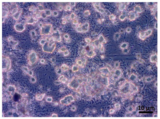 In the image obtained by fluorescent microscopy (magnification of 800×) shown in Figure 4, the nanosized graphitic structure of CBN/PVP can be observed. The lateral sizes of the graphitic sheets are between 2.5 and 10 µm. The typical irregular shape of the particles can be noticed.