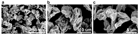 The scanning electron (SEM) micrographs of the graphitic structure, CBN/PVP, obtained after the ball-milling process are shown in Figure 5. The perfect platelet shape of the pristine graphite flakes was destroyed after 20 h of ball milling, resulting in an irregular particle shape with a flower-like morphology, which is a consequence of the agglomeration of graphene sheets [23]. The lateral size of the graphitic sheets is significantly reduced, ranging from 2 to 10 µm. Graphite particles can be observed as separate entities, with their surfaces covered by PVP molecules.