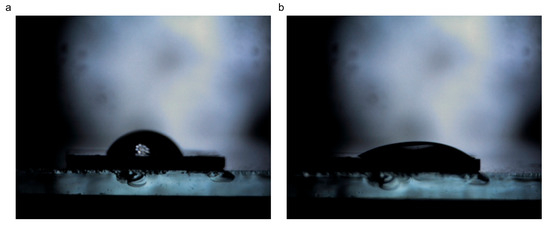 The contact angle between CBN/PVP and water: (a) initial—73°, (b) after 2 min—29°.